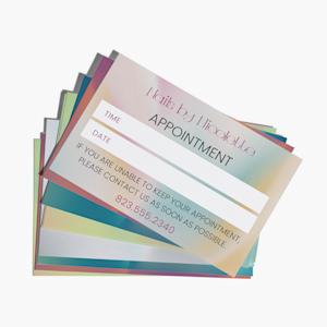 Our custom appointment cards come with a variety of options to meet your business needs. You can choose from a variety of paper stocks–all with easy-to-write-on surfaces – to make scheduling quickly personalizable. (Just keep in mind that our matte options are intended for use with ballpoint pens only.) You can also create rounded corner or square appointment cards for a fresh and unexpected look. And, to make your logo or business details pop, we offer special finishes like foil accent, raised foil or embossed gloss.