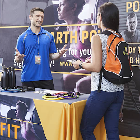 Start with the basics: Display tables, backdrops and retractable banners that let your business shine from every angle. Consider the size and scope of your average event – do you need to be spotted above a crowd, or stop attendees in their tracks as they pass by? Does your booth need a lot of space, or can you showcase your product on tabletops or shelves? Whatever your needs, our easy-to-use tools help you create the perfect event materials so you can spark connections and keep every conversation going. Then, go further with event merchandizing that reinforces your message at every touchpoint – from branded giveaways to coordinated event clothing that keep your brand top of mind.