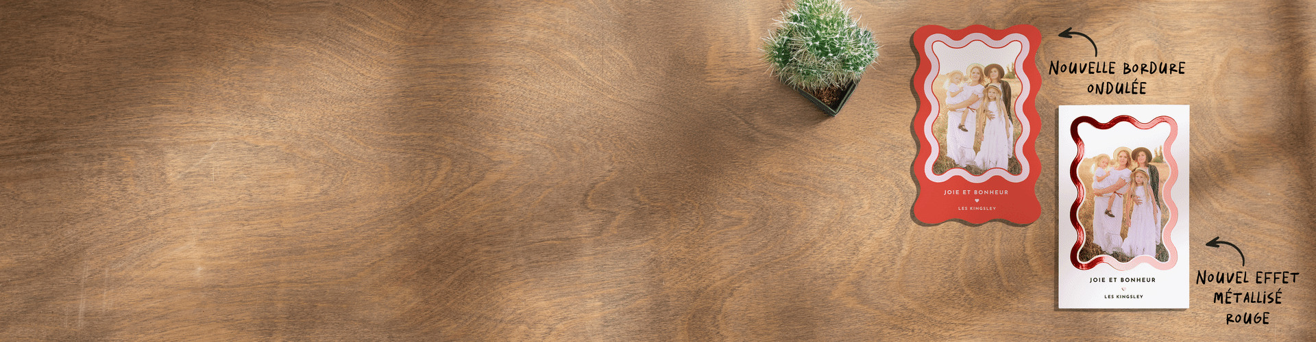 C’est facile! Commencez par découvrir tous les modèles pour les Fêtes dans notre galerie. Vous pouvez filtrer les modèles par thème, par couleur, par nombre de photos et même par type de message. Une fois que vous aurez sélectionné un modèle, nous vous emmènerons dans notre studio, où vous pourrez téléverser vos photos, ajouter un message et plus. En fonction du modèle, vous pouvez également ajouter un peu de fantaisie, comme un effet métallisé en relief ou une jolie bordure festonnée.