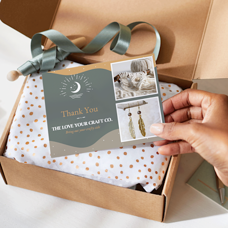 Si vous souhaitez ajouter une touche de couleur ou d’originalité à vos boîtes neutres, VistaPrint dispose d’une variété d’accessoires d’emballage personnalisables (ruban adhésif, étiquettes postales, feuilles d’autocollants, etc.). Utilisez-les pour sceller vos emballages alimentaires, communiquer des renseignements sur vos produits ou afficher votre identité de marque et votre logo. Nos produits sont faciles à personnaliser avec du texte, des images ou des informations sur votre entreprise. Et si vous avez besoin d’aide ou si vous avez des questions en cours de route, nous sommes à vos côtés.