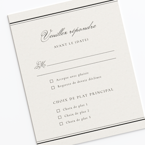 Chaque invitation appelle une réponse. Désormais, les invités à votre mariage peuvent répondre de la manière la plus élégante qui soit grâce aux cartes-réponses typographiques. L’aspect et le toucher emblématiques de la typographie rehaussent cette composante essentielle de votre ensemble de mariage, créant ainsi un magnifique article de papeterie que les invités se réjouiront d’envoyer. Leurs réponses vous aideront à tout savoir, du nombre de personnes aux préférences en matière de repas. Votre organisation sera donc un peu plus facile, et surtout, plus jolie.