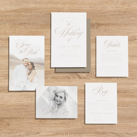 Notre collection a tous les éléments dont votre ensemble de faire-part a besoin : des faire-part, des cartes de réponse, des cartons d’accompagnement et des cartes de remerciement.