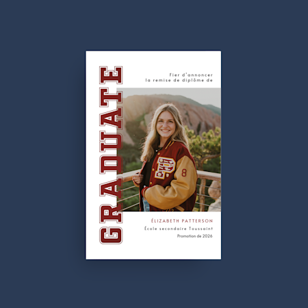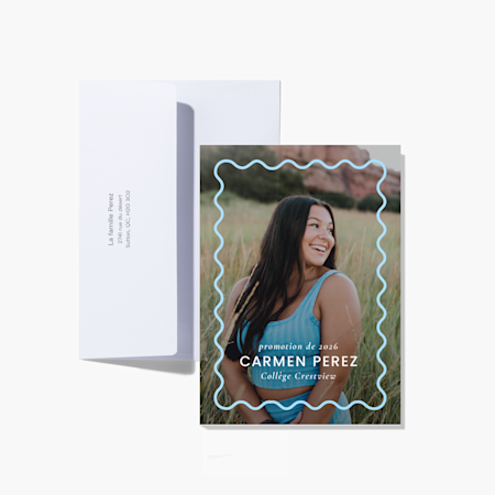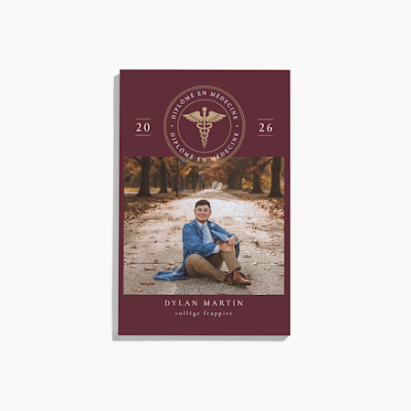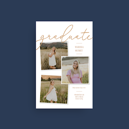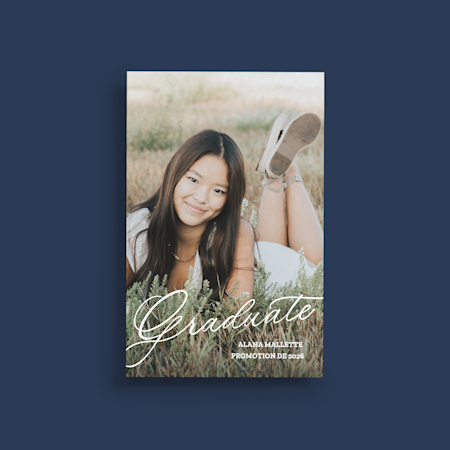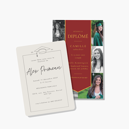 Notre collection de modèles de 2026 couvre un large éventail de styles tendance – grille de photos, minimaliste, BCBG, classique et plus –, donc vous trouverez le modèle idéal pour la personnalité de votre diplômé. Comme chaque étudiant mérite ce qu’il y a de mieux, nous proposons des cartes de remise de diplôme personnalisées pour les étudiants médicaux, les diplômes d’études supérieures et même les finissants de maternelle. Lorsque vous avez trouvé l’option qui vous convient, téléversez la photo de votre diplômé ou de sa remise de diplôme et ajoutez un message spécial. Une fois que vous avez commandé, nous imprimons vos cartes et vos fournitures d’une qualité experte. Vous pouvez nous faire confiance : nous avons beaucoup d’expérience (plus de 20 ans, en fait). Si vous avez besoin d’aide pour la conception ou la commande, nos experts sont à votre disposition. Après tout, une nouvelle comme celle-ci doit être synonyme de plaisir, et non de stress.