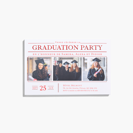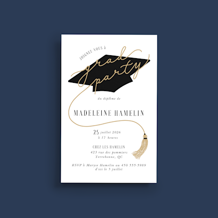 La papeterie de remise de diplôme englobe toute la papeterie requise pour annoncer ou mettre à l’honneur un étudiant qui termine ses études (pensez faire-part, annonces et bien plus). En général, les faire-part de remise de diplôme sont destinés à annoncer la réussite du finissant à la famille et aux amis, tandis que les invitations servent surtout à les convier à la cérémonie ou à une fête.