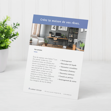 - Produits d’affichage de comptoir détaillés. Une pancarte de comptoir peut vous aider à marquer votre public, même si vous êtes en train de discuter avec quelqu’un d’autre. Ajoutez des détails à propos de vous, de ce que vous faites, de vos récents succès. Et pourquoi pas le témoignage d’un client, tant que vous y êtes? Dans les salons professionnels, les produits d’affichage sont aussi un excellent moyen d’annoncer des soldes ou des concours spéciaux.