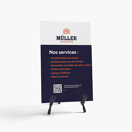 Tout dépend du modèle. Certaines pancartes nécessitent une structure. Pour d’autres, le support est déjà intégré. Si vous recherchez des produits d’affichage avec support intégré pour vos salons professionnels, nous recommandons les banderoles rétractables, les chevalets publicitaires, les banderoles en X ou les toiles de fond.