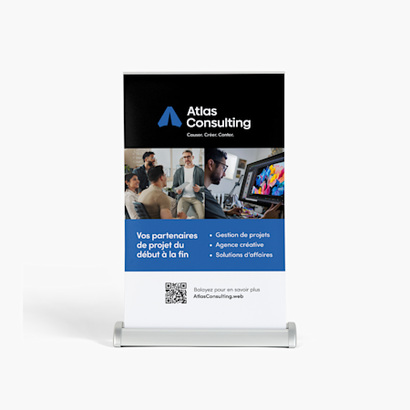 Pour commencer à créer le graphisme de vos produits d’affichage, réfléchissez à la taille et à la portée des événements ou des expositions auxquels vous participez. Votre kiosque se trouve-t-il au milieu d’un grand centre d’exposition? Procurez-vous une toile de fond avec un stand parapluie personnalisé pour votre marque. Vous pouvez même ajouter le nom de votre entreprise, votre logo et d’autres éléments de votre identité de marque. Ou démarquez-vous dans les endroits très fréquentés à l’aide d’une banderole rétractable qui se monte en seulement 90 secondes et se déplace facilement. Vous disposez d’espace mural? Exploitez-le pleinement en accrochant une banderole ou un panneau en carton-mousse pour salon professionnel aux couleurs vives et attrayantes. Quel que soit votre choix, vous pouvez améliorer encore le style de votre kiosque en y disposant des nappes et chemins de table arborant votre logo et votre site web. Pour finir, complétez le tout avec des pancartes de table qui mettent en avant des cadeaux publicitaires spécialement prévus pour l’événement ou des témoignages récents de vos clients – et préparez-vous à tisser des liens.