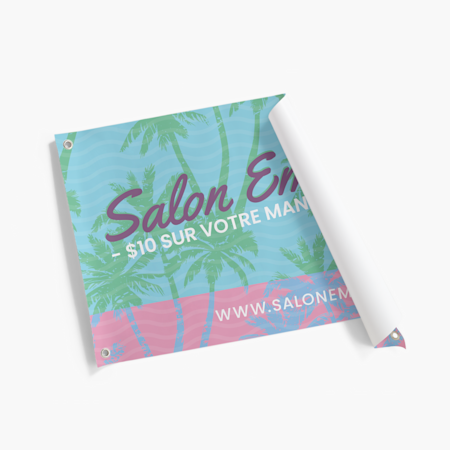 Pour une utilisation à l’extérieur : les bâches microperforées sont excellentes pour une utilisation à l’extérieur, car le tissage 70-30 laisse passer le vent. Les banderoles en vinyle, particulièrement notre option en vinyle pour l’extérieur, résistent à la décoloration et aux intempéries. Elles offrent une solution idéale pour annoncer l’ouverture d’une entreprise, par exemple. Les banderoles fanions sont aussi un excellent choix pour l’extérieur, et elles attirent le regard par leur forme unique.