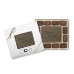 Faites le bonheur de tous les amateurs de chocolat avec la petite boîte-cadeau Joyeuses fêtes de douze délices au chocolat. Cette boîte élégante comprend un assortiment savoureux de bouchées au chocolat – idéal lorsque vous recevez ou si vous cherchez un cadeau facile. Personnalisez-la avec votre logo pour donner un maximum de visibilité à votre marque.