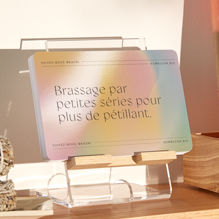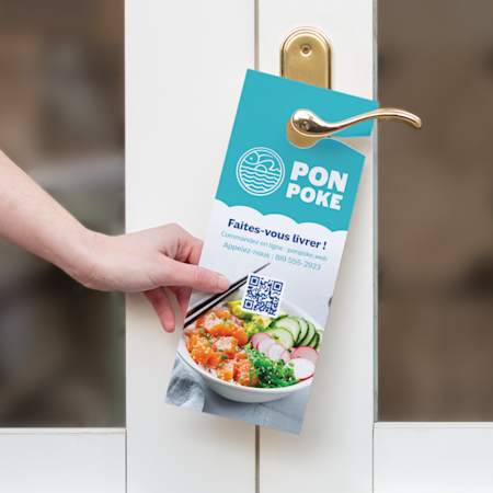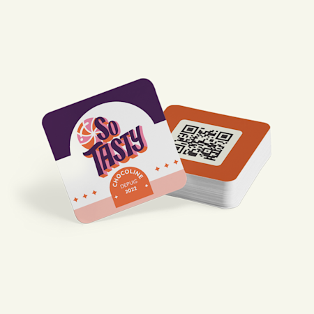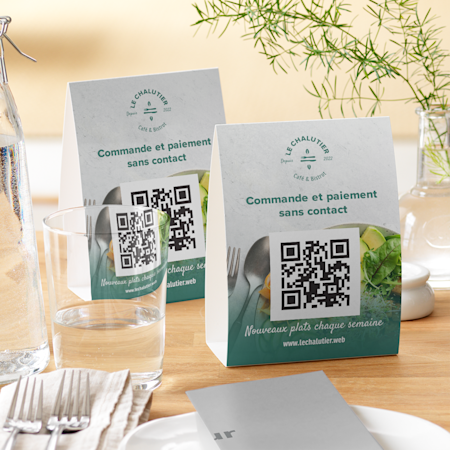 Il existe 2 façons d’ajouter des codes QR à vos supports marketing. Tout d’abord, vous pouvez parcourir notre galerie de modèles avec code QR. La sélection de l’un de ces modèles générera automatiquement un code QR unique pour vos documents imprimés. Vous pouvez aussi sélectionner l’option « Code QR » dans notre studio de création graphique. Cette option générera un code unique qui pourra être ajouté à votre graphisme. Cette fonctionnalité est disponible avec la plupart de nos produits, comme les cartes-chevalets, les cartes postales, les billets personnalisés, les affichettes de porte et plus encore.