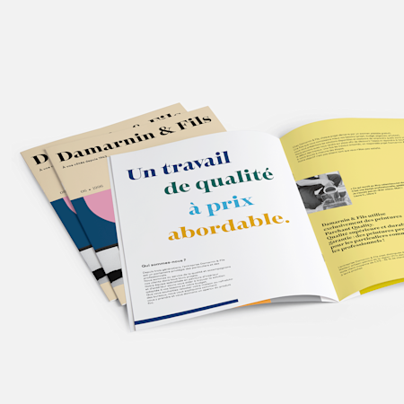 Lors de la conception de vos supports marketing avec VistaPrint, vous pouvez télécharger votre logo, ajouter les couleurs de votre entreprise et accéder à notre bibliothèque de polices pour créer une apparence cohérente pour votre marque. Si vous disposez d’un graphisme prêt à imprimer, vous pouvez le téléverser directement dans le studio de création graphique pour la plupart de nos produits. Pour un look professionnel, nous vous recommandons d’utiliser le même graphisme ou les mêmes éléments de design sur différents produits, des prospectus aux chemises de présentation, en passant par les livrets et plus encore.