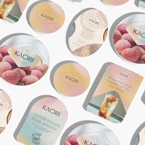 An arrangement of different die-cut postcard shapes, advertising a specialty beverage company.