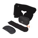 - Includes two soft foam earplugs, black eye mask and inflatable neck pillow