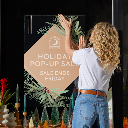 Ready to deck out your business with some custom Christmas signage and spread cheer all season long? VistaPrint’s personalized holiday signs can highlight your special offers, make your retail space inviting and create a memorable atmosphere that keeps customers coming back. Browse our variety of festive designs or upload your own holiday-themed one. Whether you have a specific vision in mind or need some inspiration, we’re here for you. Change colors, add text, upload imagery and adjust the layout until everything looks just right. The result is a professional, eye-catching sign that captures the holiday spirit – and celebrates your brand.